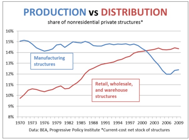 Tablo imal eden(üretim yapan) binalara karşı perakende, toptan satış yapan ve depo(dağıtım) amaçlı kullanılan binaların oranlarını gösteriyor. 2001 civarlarında iki çizginin kesiştiği yer dağıtımın(tüketim) Amerika ekonomisinde üretimden daha önemli hale geldiğini gösteriyor.