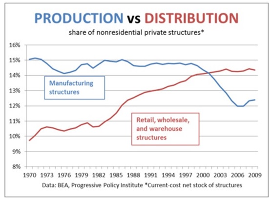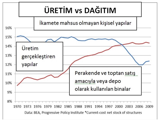 Tablo imal eden(üretim yapan) binalara karşı perakende, toptan satış yapan ve depo(dağıtım) amaçlı kullanılan binaların oranlarını gösteriyor. 2001 civarlarında iki çizginin kesiştiği yer dağıtımın(tüketim) Amerika ekonomisinde üretimden daha önemli hale geldiğini gösteriyor.